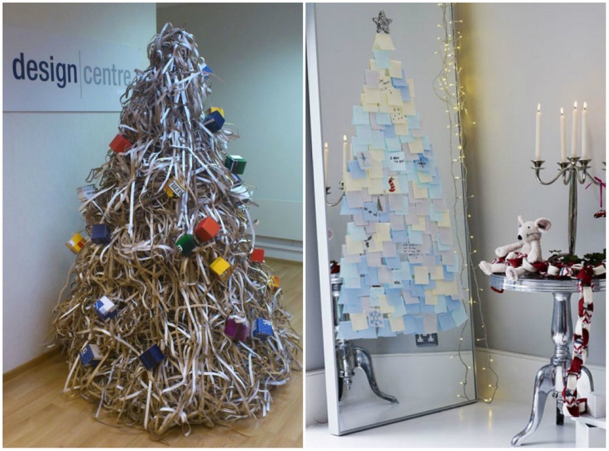 Перед святом не поспішайте позбавлятися від подрібненої паперу або старих стікерів: з них можна спорудити ось такі дерева.