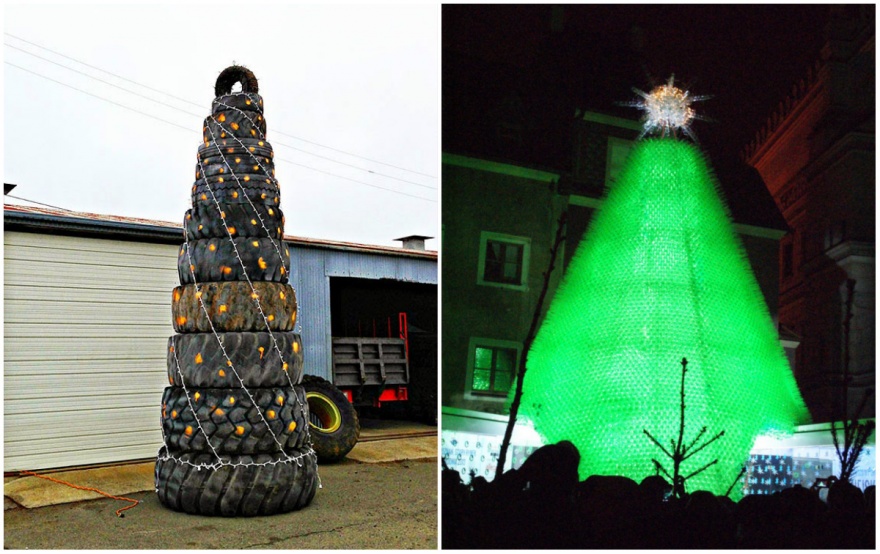Хто сказав, що ялинка має стояти вдома? Зробіть її зі старих шин або пластикових пляшок і поставте у дворі будинку.