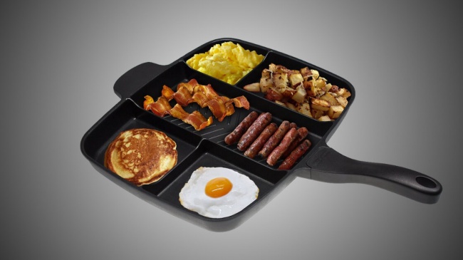 Тепер, щоб приготувати на сніданок яєчню, млинці і підсмажити бекон і ще що-небудь, необов'язково використовувати декілька сковорідок. Всі страви вмістяться на одного, так як сковорода Master Pan з антипригарним покриттям має 5 окремих секцій.