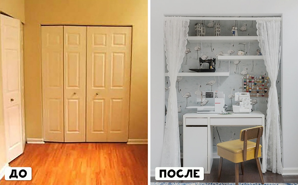 Куточок для справжнього творця. І все це зроблено в ніші для шафи. Парочка полиць, оригінальні шпалери, акуратний стіл і штори — все, що потрібно для творчої особистості. А для ідеального поєднання дошку на підлозі можна замінити темним паркетом.