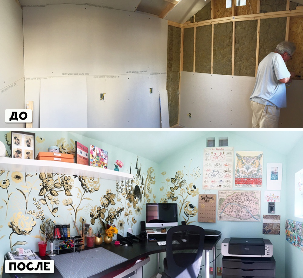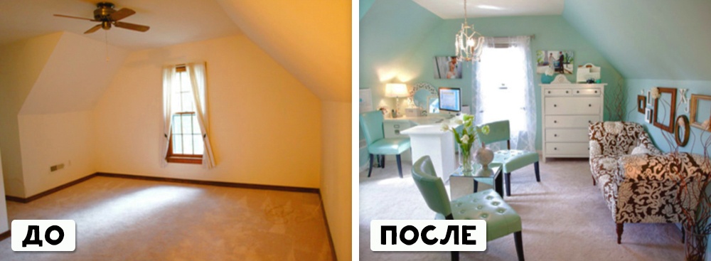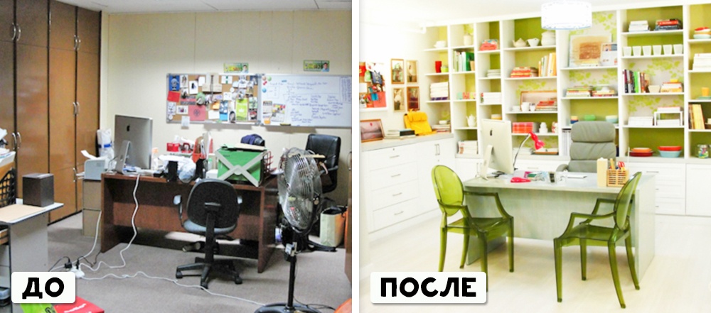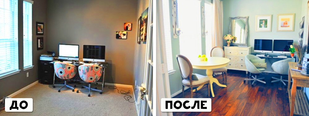 Для того, щоб працювалося найбільш плідно необхідно створити навколо себе обстановку, яка буде цьому сприяти. І холодні голі стіни — це те, чого однозначно варто уникати. У варіанті «Після» колірна палітра містить яскраві кольори, що контрастують з підлогою та іншими природними дерев'яними елементами. На підлозі, до речі, зведено штучно зістарена паркетна дошка. Якщо працювати, то тільки в такій кімнаті!
