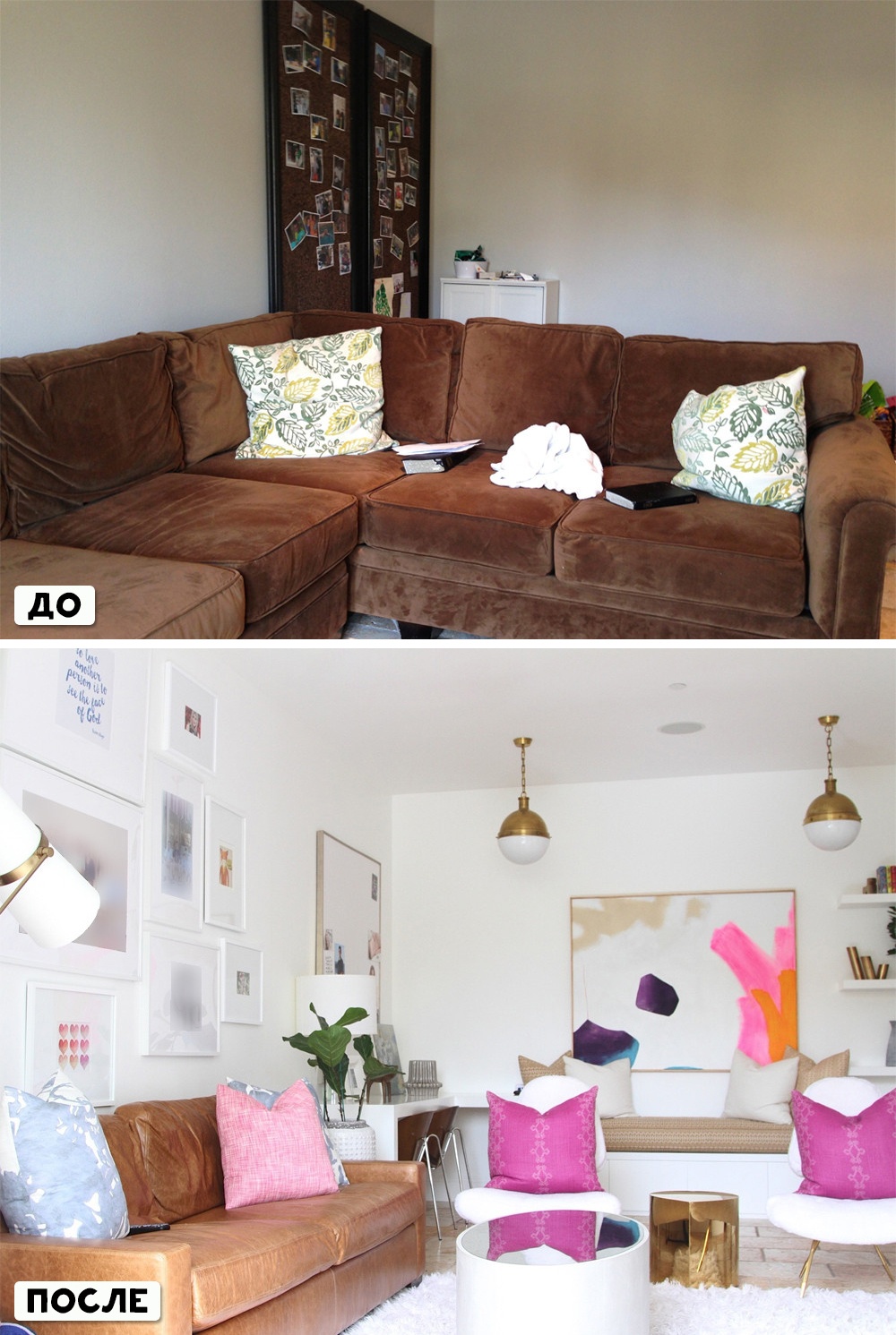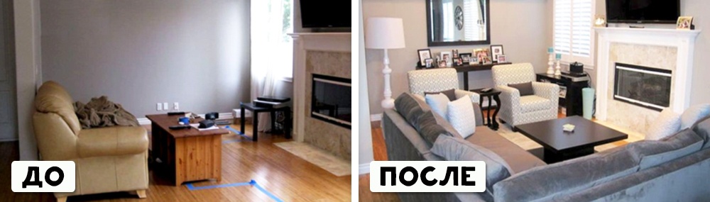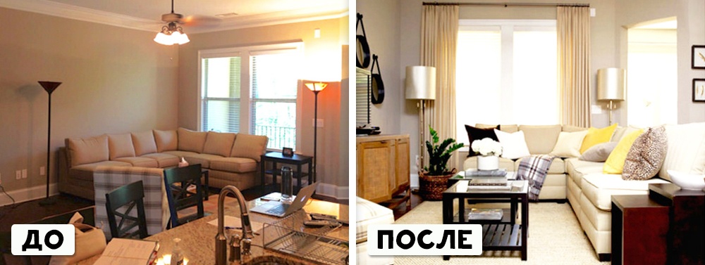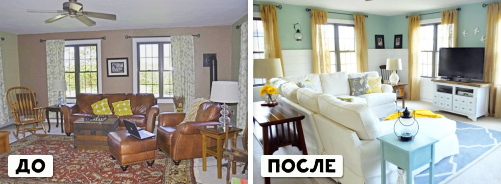 Ніяких кардинальних змін у цій кімнаті не сталося, але тепер вона виглядає значно ефектніше. Все, що потрібно, так це замінити нинішнє вікно на панорамне, стіни пофарбувати в більш теплий бежевий колір, поміняти меблі і підібрати під неї торшери. Підлогу можна також залишити колишнім, просто покривши його шаром лаку.