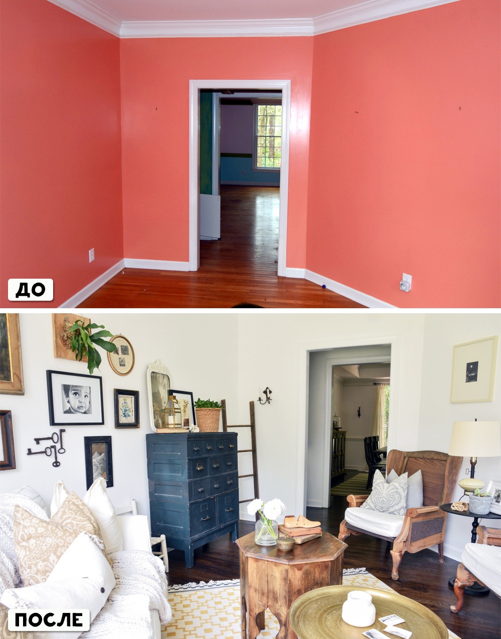 Ця вітальня перетворилася до невпізнання. Вона була виконана в традиційному стилі з переважанням темних кольорів. Тепер же це яскрава кімната, виконана в стилі «котедж». Для цього стилю характерна одна кольорова гама, функціональна меблі і використання переважно білого кольору. Стіни також обшиваємо вибіленим дубом. Непрактично, скажете ви? Але при належному догляді, така краса однозначно прослужить вам довго.