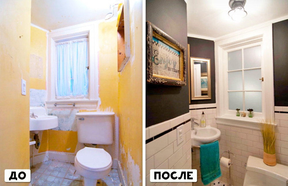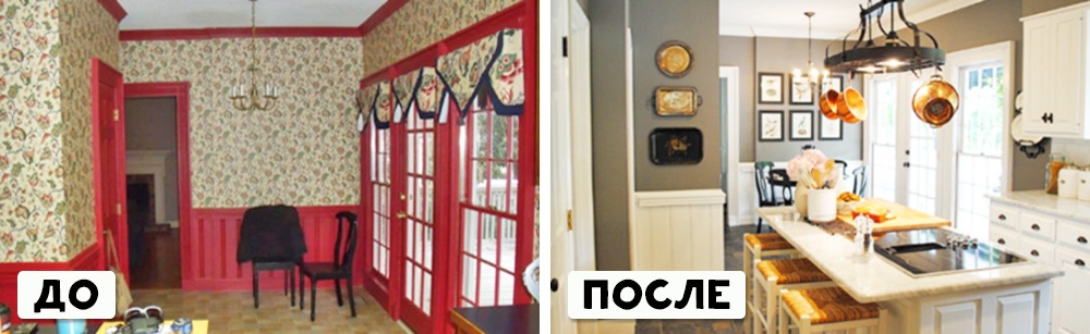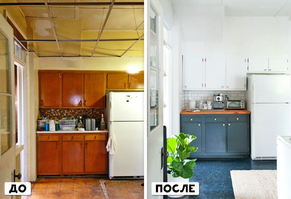 У цьому випадку обійтися просто фарбуванням стін і додаванням пари елементів декору було б просто неможливо. Кухня повністю оновлена. Дуже виграшно завжди виглядає поєднання білого і кольору морської хвилі, а яскравою плямою в кімнаті буде велике кімнатна рослина. На підлогу кладемо плитку під мармур. Розташування меблів на кухні залишилося колишнім, але вигляд зовсім інший, чи не правда?