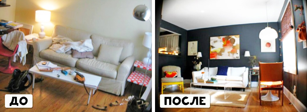 Зробити з темною і похмурою кімнати яскраву — це звичайна справа. Але раптом господарям вже дуже подобаються темні кольори. І така вітальня — ідеальний варіант. Потрібно лише пофарбувати стіни в будь-який темний відтінок. На такому тлі будь-яка світла і яскрава меблі буде виглядати дуже ефектно. Підлогу змінювати необов'язково, достатньо просто покрити його шаром лаку, і він буде виглядати як новий.