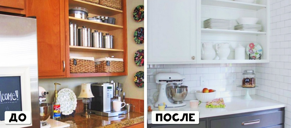 Якщо ви хочете, щоб ваша кухня виглядала яскраво і привабливо, необов'язково просто забивати всі полиці різними статуетками, кошиками, яскравою посудом і так далі. Часто для того, щоб приміщення виглядало стильно, потрібно навпаки щось прибрати. Задумайтеся, чи треба все це на вашій кухні? Визначтеся зі стилем і колірною гамою, знайдіть правильне застосування відкритим полицям, все зайве, не замислюючись, забирайте.