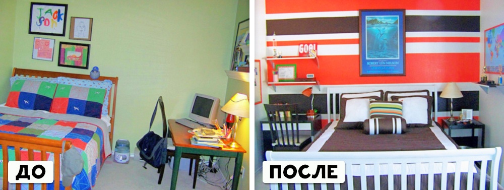 Коли хлопчик виріс, його дизайн кімнати треба негайно міняти. Він напевно більше не грає в іграшки, і напевно вже надивився на всі ці дитячі малюнки і плакати з супергероями на стінах, тому їх одразу надсилайте на горище. Від милого зеленого кольору теж доведеться відмовитися. Його замінять стильні двоколірні акрилові смуги на одній зі стін. Величезний робочий стіл можна замінити на стильний невеликий столик, а ліжко просто оновити, перефарбувавши в білий колір.