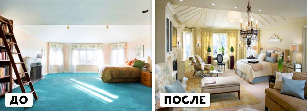 Це варіант для тих, хто хоче кардинально змінити свою величезну спальню. Нішу в полотке обшиваємо фанерою і обробляємо дерев'яними рейками, це візуально зробить стелю ще вище. Маленькі споти замінюємо точковими світильниками. Для меблів вибираємо теплі кольори. З першого погляду, кімната повністю заставлена, але насправді тут все дуже продумано і функціонально.