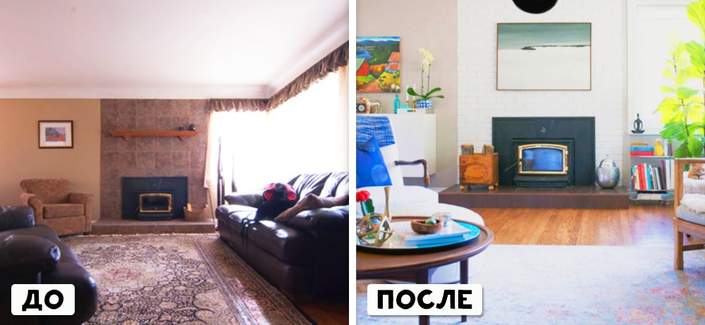 Все що потрібно для того, щоб позбутися від цієї обителі коричневого кольору», так це всього-навсього трохи оновити дошку на підлозі, покривши її шаром лаку, категорично відмовитися від облицювання холодної коричневою плиткою камінного порталу. Її варто видалити, поштукатурити поверхню і обкласти її клінкерною плиткою. Стіни, включаючи і камінний портал, покриваємо білою акриловою фарбою.