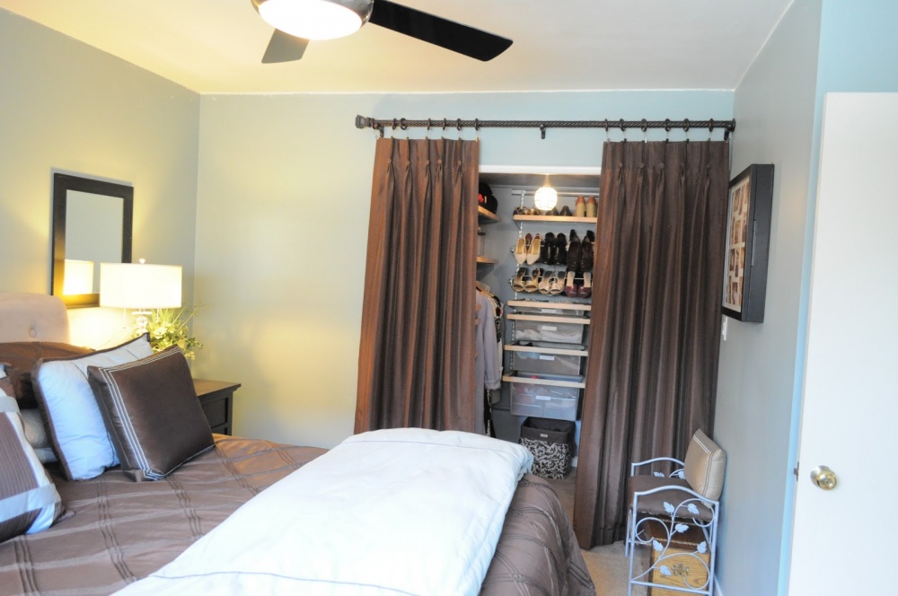 4. В якості альтернативи звичного шафі можна вибрати вбиральню у ніші в стіні. А невагомі двері у вигляді штор збережуть легкість в інтер'єрі.