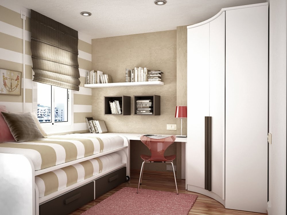 7. Якщо невелика спальня належить школяру або студенту, з'являється необхідність в робочому просторі. Вся меблі в такій кімнаті повинна бути компактними і максимально функціональною.