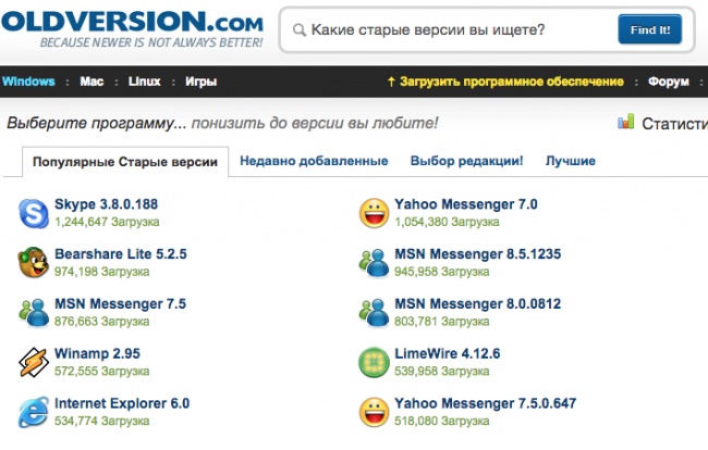 Ви твердо впевнені в тому, що стара версія програми була краще і зручніше, а в новій версії розробники все зіпсували? Завдяки цьому сайту ви можете вибрати потрібну версію програми, якщо на офіційному сайті завантажити потрібну версію не представляється можливим.