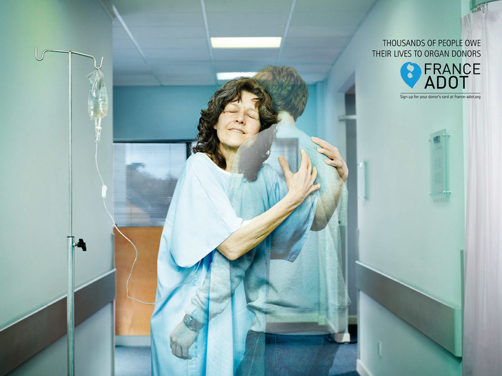 Інформаційна кампанія France ADOT у своєму рекламному плакаті і слогані нагадує про те, що тисячі людей зобов'язані своїм життям донорів органів.