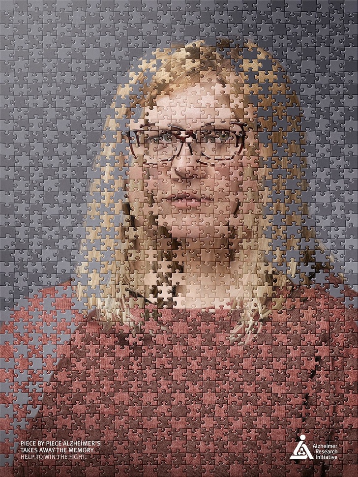 Німецька інформаційна кампанія Alzheimer Forschung, спрямована на підвищення інформування про хвороби Альцгеймера. «Шматочок за шматочком хвороба Альцгеймера забирає пам'ять. Допоможіть нам виграти бій».