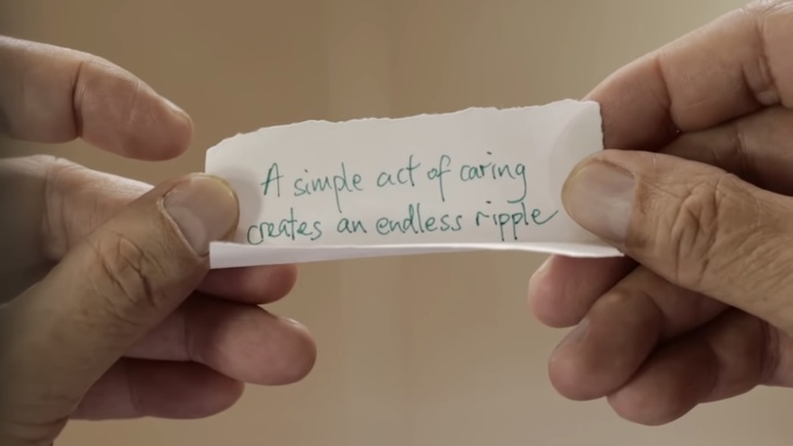 Дві схожі історії об'єднує ще й записка, яку в дитинстві разом з тортом отримав незнайомець, а тепер передав її дівчинці. На маленькому клаптику паперу було написано: «Простий акт турботи створює нескінченну ланцюжок». І автора цих слів ми дізнаємося в самому кінці ролика.