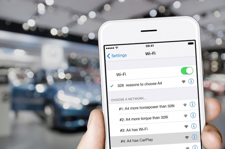 У нью-йоркському автосалоні компанія Audi налаштувала купу безкоштовних Wi-Fi-мереж, назви яких говорять про те, що Audi A4 перевершив BMW 328i