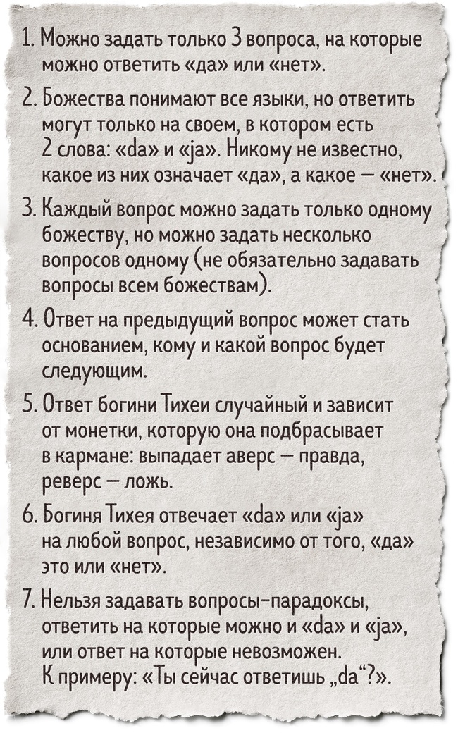 Розшифровка відповіді: якщо бог B відповідає «я», значить, або це і є Тихея (і відповідає випадковим чином), або це не вона, а насправді божество A — богиня Тихея. У будь-якому варіанті божество C — це не вона. Якщо ж B відповідає «da», то або це Тихея (і відповідає випадковим чином), або B не Тихея, що означає, що бог А — це теж не Тихея. У будь-якому варіанті бог A — це не богиня випадку.