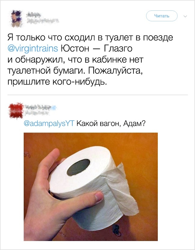 Молодий британець на ім'я Адам потрапив у досить делікатну ситуацію: сходивши в туалет в поїзді, він виявив, що в кабінці немає туалетного паперу. Від безвиході він написав у твіттер компанії Virgin Trains. Йому не просто відповіли, а ще й допомогли вийти з делікатного становища.