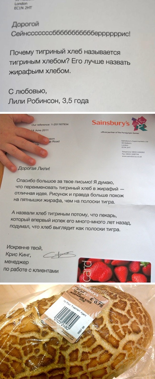 Лист, написаний 3-річної Лілі Робінсон на адресу британського ритейлера, розмістила в своєму блозі мама дівчинки. Після того як воно швидко розійшлося по соціальним мережам, Лілі прийшла відповідь від менеджера sainsbury's Кріса Кінга. «Дорога Лілі! Я думаю, що перейменувати тигрячий хліб у жирафий — відмінна ідея. Малюнок і правда більше схожий на цятки жирафа, ніж на смужки тигра», — наголошувала лист. Згодом на прилавках магазинів мережі дійсно з'явився жирафий хліб.