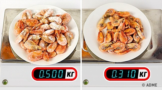 При продажу будь-яких заморожених товарів вкрай важливий вага продукту. Тому, щоб підвищити ціну, деякі маркетологи додають в упаковку воду, яка може становити до 50 % ваги товару. А в деяких випадках, крім води, в упаковці можуть перебувати інші неїстівні частини. В результаті самого продукту може залишитися всього 25-35 %.