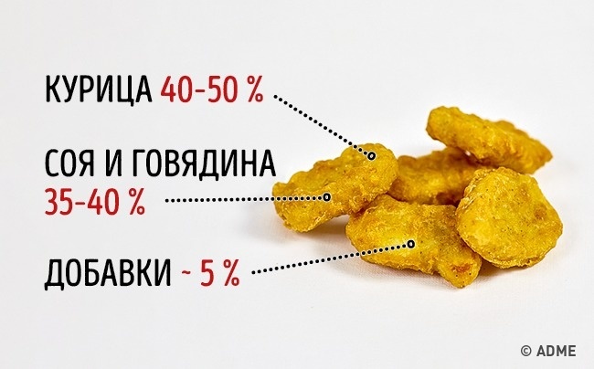 Хоч нагетси і називають курячими, м'яса курки в них не так багато. Справа в тому, що суміш для класичних нагетсів складається з курячого фаршу тільки на 50 %. Інші 50 % — це соя і яловичина.