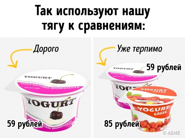 Якщо покупці вважають якийсь товар невиправдано дорогим і обходять його стороною, маркетологи роблять хитрий хід. Вони додають в асортимент аналогічний товар за більш високою ціною, на тлі якого перший продукт вже зовсім не здається дорогим. І продажу знову рухаються вгору.