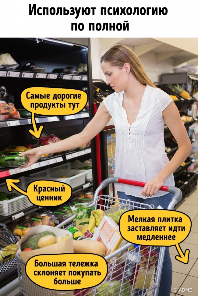 - Орієнтація зліва направо. У багатьох супермаркетах рух відвідувачів побудовано проти годинникової стрілки. Ми весь час повертаємо наліво, і наш погляд найчастіше падає на середину стіни праворуч від нас. Саме в цьому місці ставлять продукти, у яких закінчується термін придатності, або найдорожчі товари.