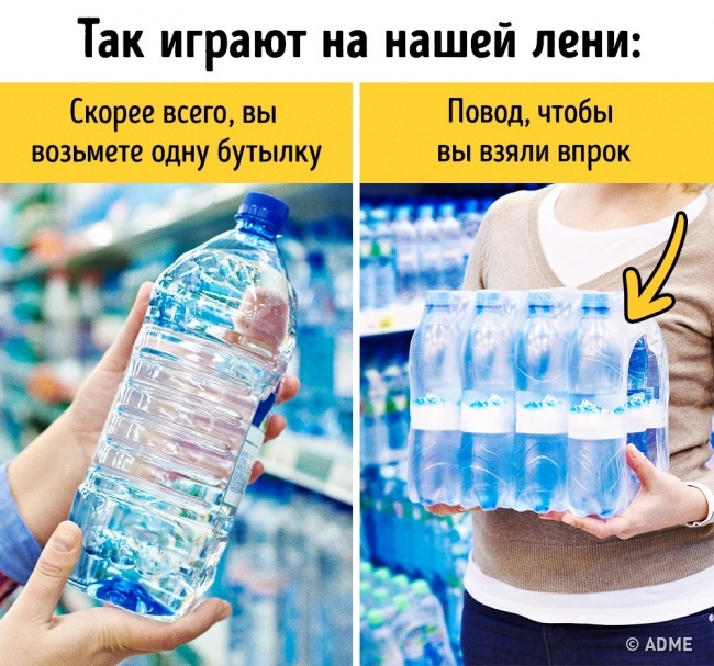 Мерчандайзери в супермаркетах знають, що нам буде лінь розкривати поліетиленову плівку і доставати з упаковки одну пляшку води. І вони також знають, що багатьом в голову прийде думка, що можна взяти з собою всю упаковку, про запас.