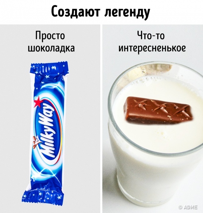 Відмінний хід — придумати легенду, яка оточує товар, немов ореол. І зовсім не важливо, чи є в ній сенс. Багато згадають рекламу батончика Milky Way, яку показували по телевізору в країнах Європи на початку 90-х. Батончик позиціонувався як плаваючий в молоці. Який у цьому сенс? Ніякого. Але це стало відмітним знаком, якоюсь фішкою Milky Way.