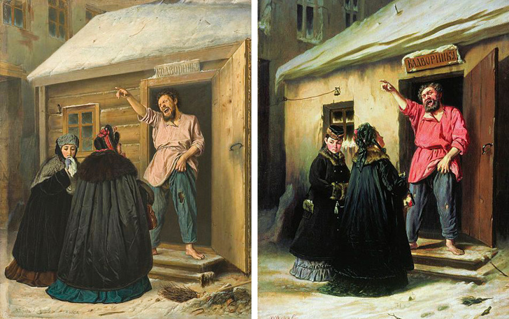 Герой картини явно вказує на верхній поверх, а там, як правило, перебували квартири для найменш забезпечених мешканців. Василь Перов двічі малював цю картину. На полотні, намальованому через 12 років, двірник одягнений у червону сорочку, у нього більш злий вираз обличчя, а на табличці над дверима з'явилася помилка: замість «Кодворнику» написано «Кадворнику». При цьому одягу жінок стали більш простими.