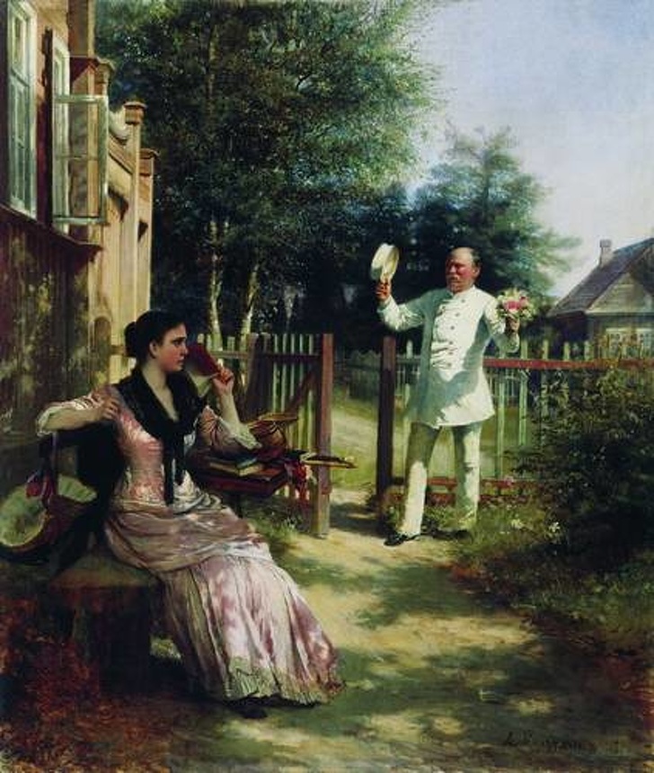 З назви картину легко зрозуміти, що дівчина явно не рада настирливому кавалеру. Але чому у неї таке перелякане обличчя? Залицяльник, ймовірно, приходить до коханої не перший раз, він не втрачає надії завоювати її, і, судячи з раскрасневшемуся особі, навіть трохи випив. Молода дама намагається всіляко сховатися, закритися від того, до кого не лежить душа.