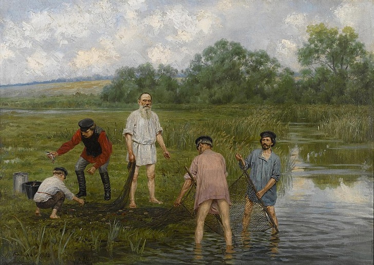 Це була б звичайна побутова замальовка, якби Наркиз Миколайович Бунін не зобразив у числі інших рибалок... Антона Чехова, Іллю Рєпіна і Льва Толстого в одних сорочках. Газети того часу розповідають, що незадовго до цього Рєпін написав портрет Толстого в босом вигляді. Письменник подякував живописця за те, що той залишив йому панталони.