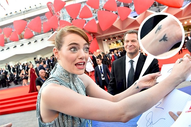 Що ці курячі лапки роблять на зап'ясті оскароносної красуні Емми Стоун? По-перше, це не курячі лапки, а лапки дрозда. Того самого, який фігурує у пісні The Beatles «Blackbird». За словами актриси, ескіз тату був створений самим Полом Маккартні. Точно така ж татуювання красується і на зап'ясті матері Стоун, яка поборола рак. Сімейний похід в тату-салон був приурочений саме до цієї радісної події.