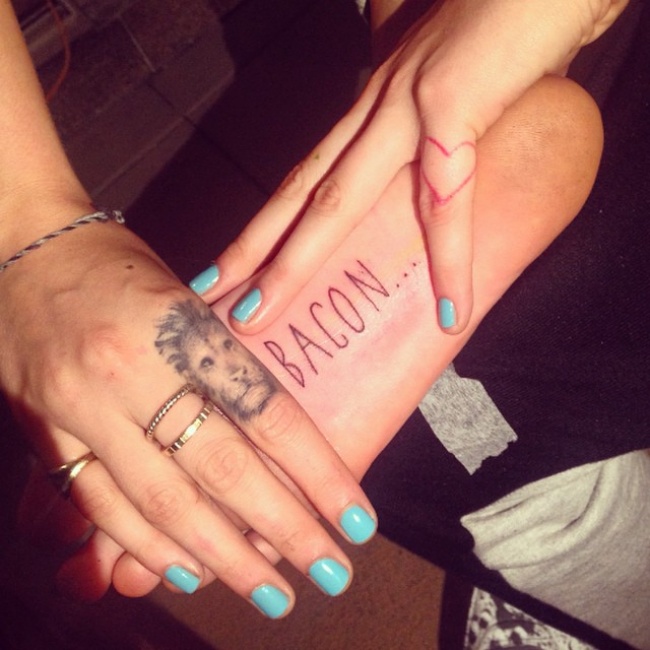 Набивати на своєму тілі когось або щось, що ти любиш, — поширене явище. Але як бути, якщо ти любиш бекон? Модель і власниця наймодніших брів Кара Делевінь, наприклад, думає про нього раз в 5 секунд. Тому вона і витатуювала на стопі слово «Бекон». «Наша любов взаємна і триватиме вічність», — зізнається модель. Ну що ж, бекон так бекон.