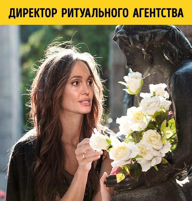 Ця фатальна красуня зараз цілком могла б бути не расхитительницей, а заполнительницей гробниць. Адже в юності Джолі була так розчарована огидно організованими похоронами свого дідуся, що твердо вирішила стати директором поховального бюро і навіть замовила відповідну ліцензію.