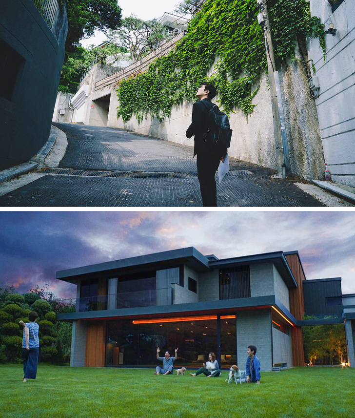 З будинком багатіїв Паків ще цікавіше: ще під час написання сценарію та створення розкадровок режисер картини знав, як приблизно має виглядати особняк. Все, що знімалося в будинку, знімалося не просто так, і всі пересування були сплановані заздалегідь, щоб показати, як герої спритно ховаються, шпигують, крадуться — як справжні паразити. Увага приділялася навіть того, з якого боку на будинок Паків буде світити сонце, — це було важливо для сцени розв'язки. Є і ще одна важлива деталь, яка зустрічається буквально на протязі всього фільму. Здогадалися, про що ми?