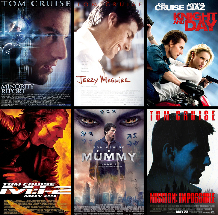 - В колажі — постери до фільмів: «Особлива думка» (2002); «Джеррі Магуайер» (1996); «Лицар дня» (2010); «Місія: нездійсненна — 2» (2000); «Мумія» (2017); «Місія: нездійсненна» (1996).