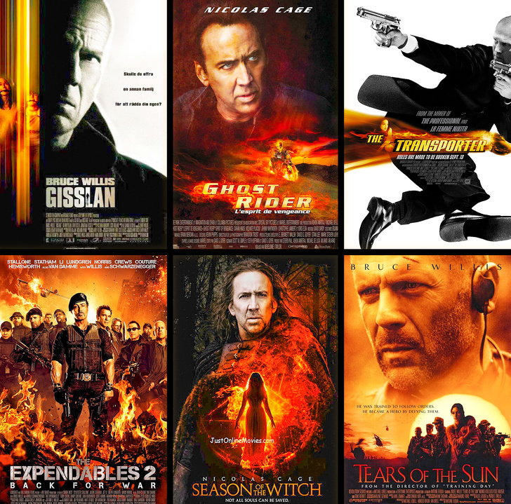 - В колажі — постери до фільмів: «Заручник» (2005); «Примарний гонщик» (2007); «Перевізник» (2002); «Нестримні-2» (2012); «Час відьом» (2011); «Сльози сонця» (2003).