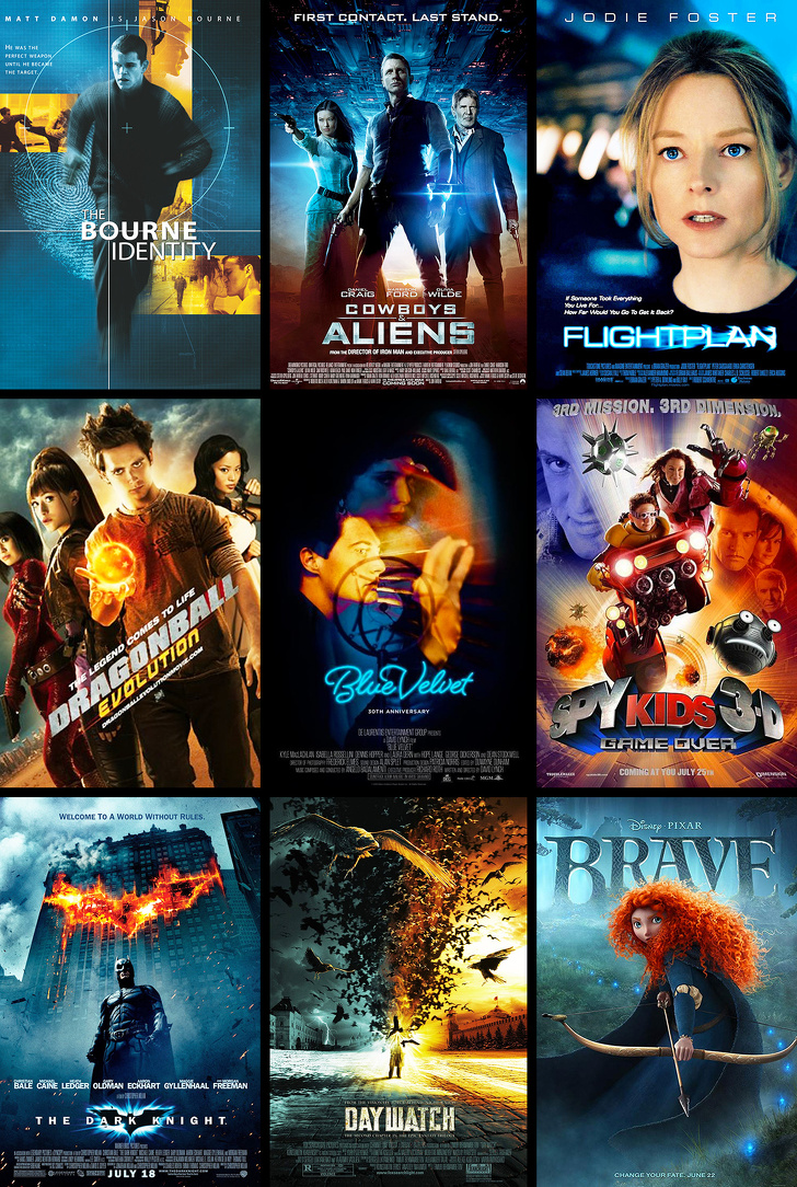 - В колажі — постери до фільмів: «Ідентифікація Борна» (2002); «Ковбої проти прибульців» (2011); «Ілюзія польоту» (2005); «Драконівські перли: Еволюція» (2009); «Синій оксамит» (1986); «Діти шпигунів 3-D: Гра закінчена» (2003); «Темний лицар» (2008); «Денний дозор» (2006); «Хоробра серцем» (2012).