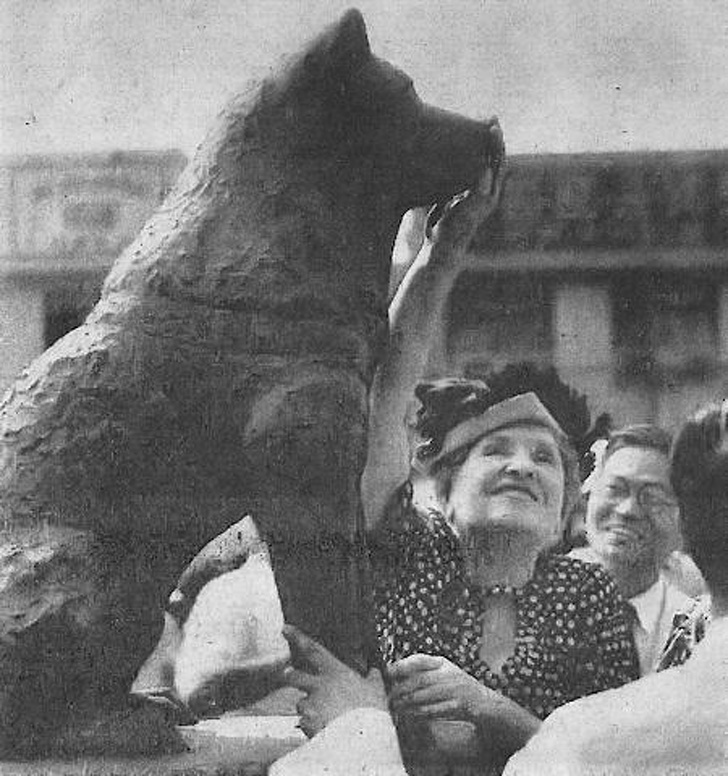 Письменниця і активістка Хелен Келлер гладить статую Хатіко.