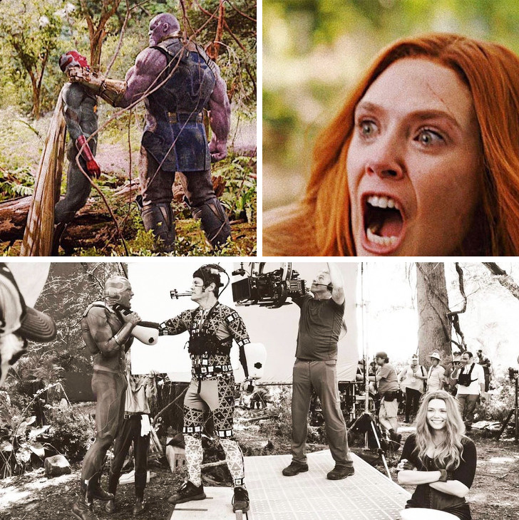 До того ж, мабуть, нелегко правдоподібно грати, коли той, кого ти повинен ненавидіти в кадрі, бігає по знімальному майданчику в сірому трико, та ще й променисто посміхається, час від часу. Ось і Елізабет Олсон, що зображає вбиту горем Червону Відьму, за кадром радісно сміється, спостерігаючи за, мабуть, однією з найбільш драматичних сцен «Війни нескінченності».