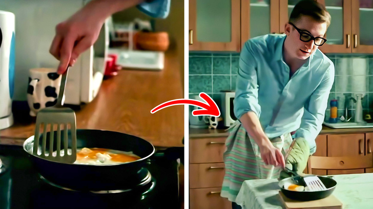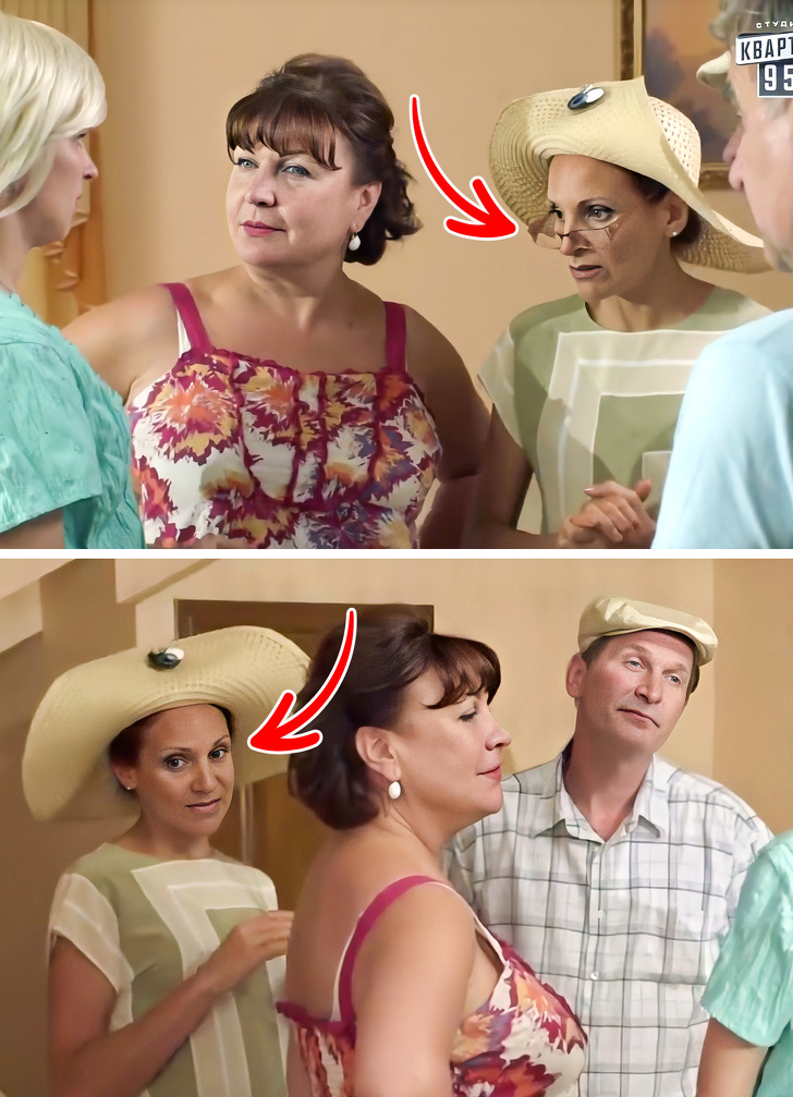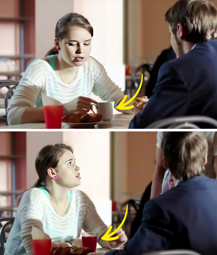 - Під час невеликого чаювання на великому плані видно, що Настя тримає чашку лівою рукою, а блюдце — правою. Після цього відразу слід зйомка дальньої камерою, де можна розгледіти, що положення предметів у руках героїні змінюється.