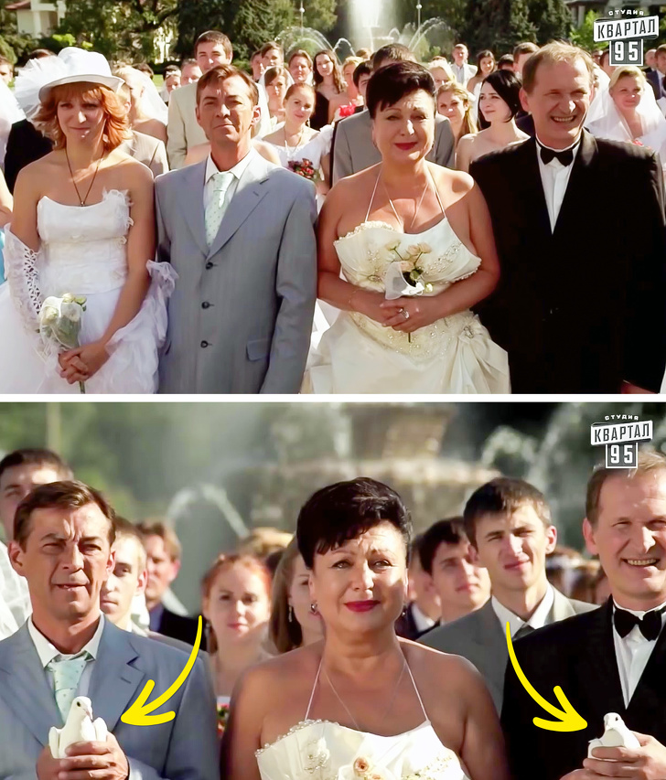 - На першому кадрі чоловіки стоять з порожніми руками. Але при зміні плану можна побачити, що вони тримають голубів. Втім, коли камера повертається назад, композиція знову здобуває колишній вигляд.