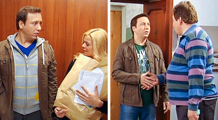- Костя йде в гості до брата. У ліфті він зустрічається з його сусідкою Ксюшею з 67-ї квартири. В цей час на ньому один комплект одягу. А от коли Костя виявляється на порозі в Ліні, одягнений він вже в зовсім інші речі, окрім куртки і джинси.