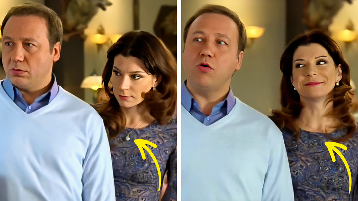 - Коли Костя і Віра розмовляють з адміністратором, кулон спочатку знаходиться поверх сукні, а потім, після кадру зі спини, раптово виявляється схованим під тканиною.