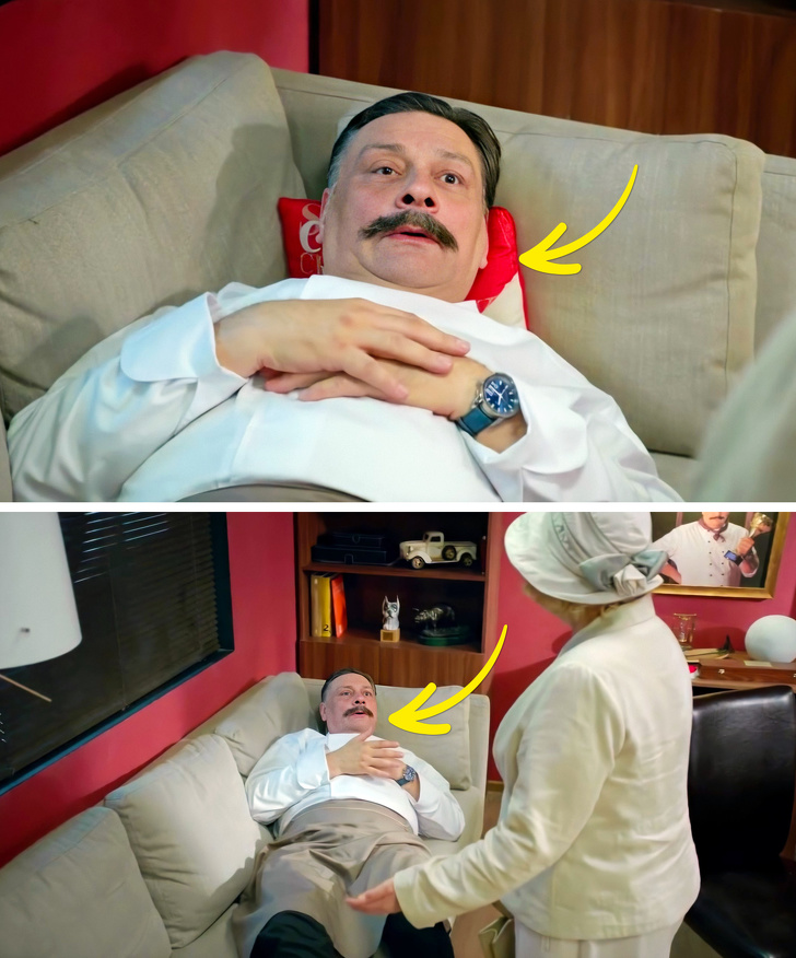 - Шеф-кухар Віктор Петрович вирішив трохи відпочити в своєму кабінеті, затишно влаштувавшись на подушці з символікою свого улюбленого клубу «Спартак». Але при зміні ракурсу можна помітити, що вона кудись випарувалася.