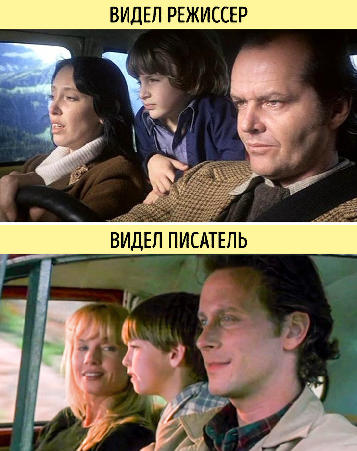 - Кубрик усунув Кінга від роботи над сценарієм і став працювати з коханою романисткой Дайаною Джонсон. У парі з нею він прибирає зі сценарію важливі для письменника психологічні моменти, адже головний герой був альтер его Кінга.