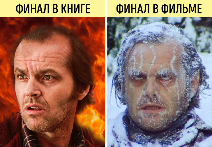 - Кінгу лестило увагу іменитого режисера, але він швидко розчарувався і не очікував від виходу фільму нічого хорошого. Кубрик скоротив кількість містики, в яку абсолютно не вірив, але яка була візитною карткою Кінга ("привиди в фільмі — це по більшій частині плід фантазії сім'ї Торренсов). І абсолютно змінив фінал: у книзі готель згорає, а Джек гине у вогні і дає можливість своєї сім'ї врятуватися; в фільмі готель залишається чекати нові жертви, а головний герой замерзає, що абсолютно не відповідало задуму письменника про «спокутну жертву Джека».