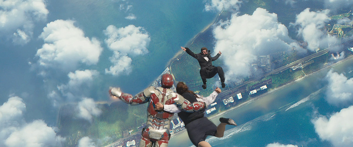 У цій знаменитій сцені з фільму «Залізна Людина — 3» виявилося набагато менше комп'ютерної графіки, ніж ми могли уявити (враховуючи любов Marvel до яскравих спецефектів). За сюжетом, Тоні повинен встигнути підхопити всіх пасажирів, які випали з літака. Ніякого хромакея і мальованого неба тут немає — такий трюк насправді викликалася виконати команда каскадерів Red Bull.