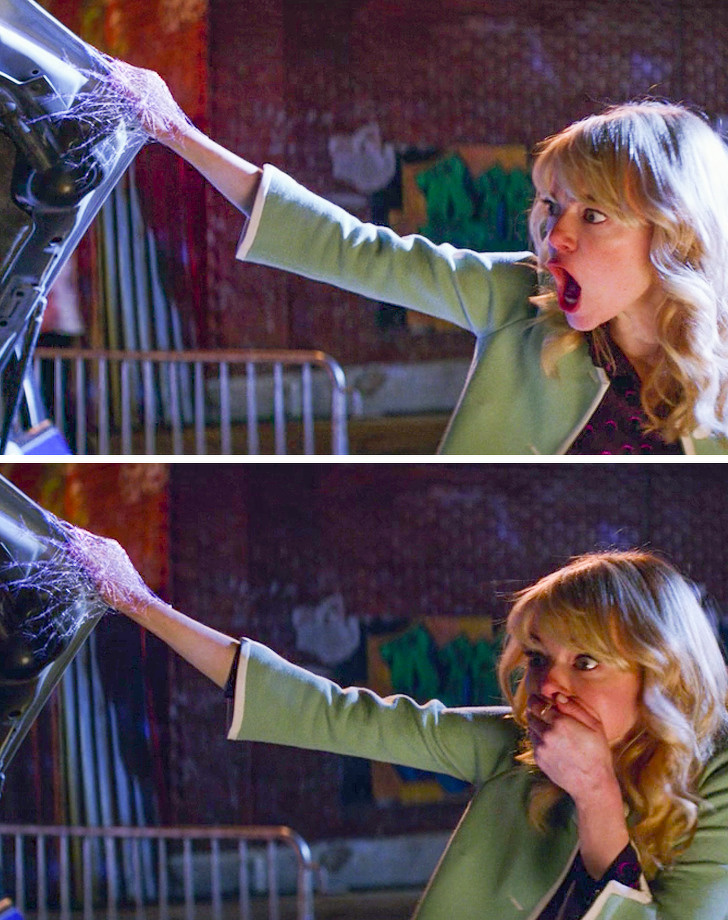 Коли Людина-павук йде, «прив'язавши» Гвен павутиною до машини, вона гукає його на людях реальним ім'ям, тим самим видаючи його особистість. Цього не було в сценарії, актриса Емма Стоун просто обмовилася, тому машинально затиснула рот рукою.